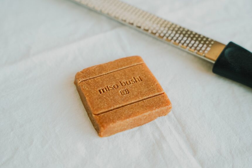 使用している味噌は、170年以上の歴史を誇る小田原の老舗、加藤兵太郎商店の木桶仕込み味噌。味噌の水分を抜いて乾燥させるだけでは、削れるような固い固形物にすることは困難だったとか。そこで、Shonan Soy Studioの商品「ナットウジャーキー」や「発酵サラダふりかけ」を製造する際に得た技術を応用し、チーズのように削れる固形化が実現しました。