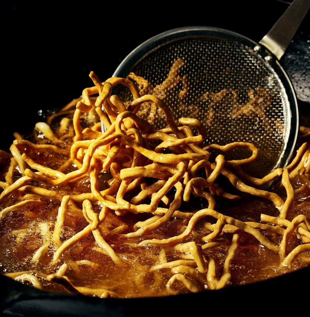 口の中に入れると、麺をコーティングしているオリジナルスープがじゅわっと広がります。1 度単位で温度調節が大切なチョコレート洋菓子ならではの技術から着想した製造方法です。麺は、かりんとうづくりで培われた“三度揚げ”の技術を応用し、中温・低温・高温の順で揚げることで、ガリっとした軽い食感を実現しています。